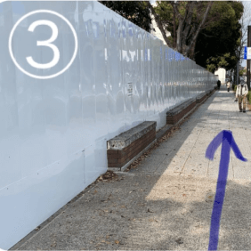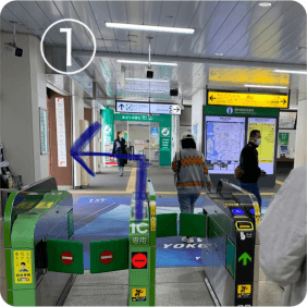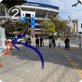 - ⽇本⼤通り駅のスタジアム⼝に上がって頂き、振り返り横浜スタジアム⽅⾯へ歩きます。
