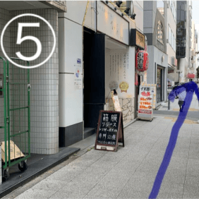 - 道なりに⾏くとファミリーマートとアがみがありますので、通り過ぎて次の横断歩道を渡った次の⾓のビルになります。